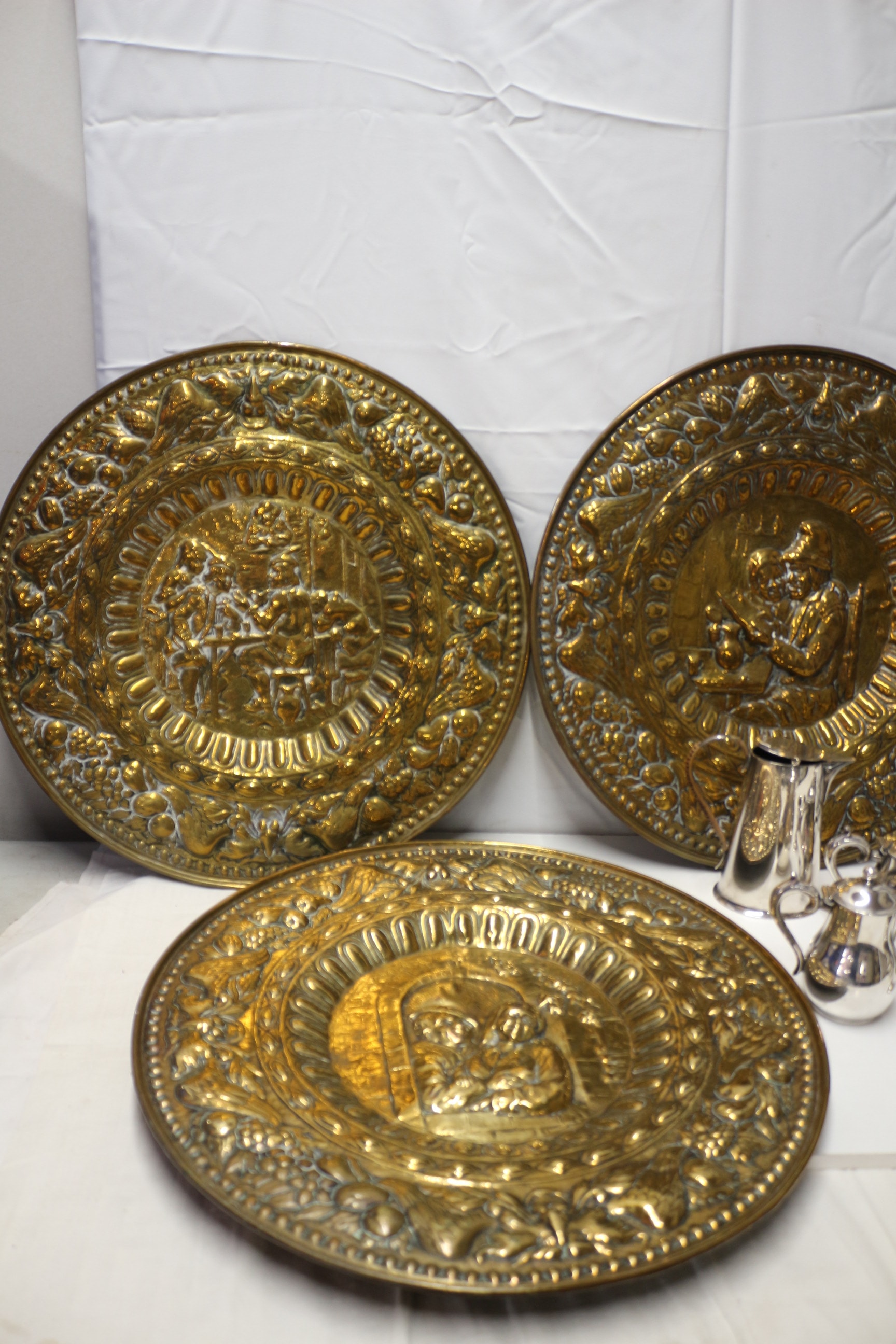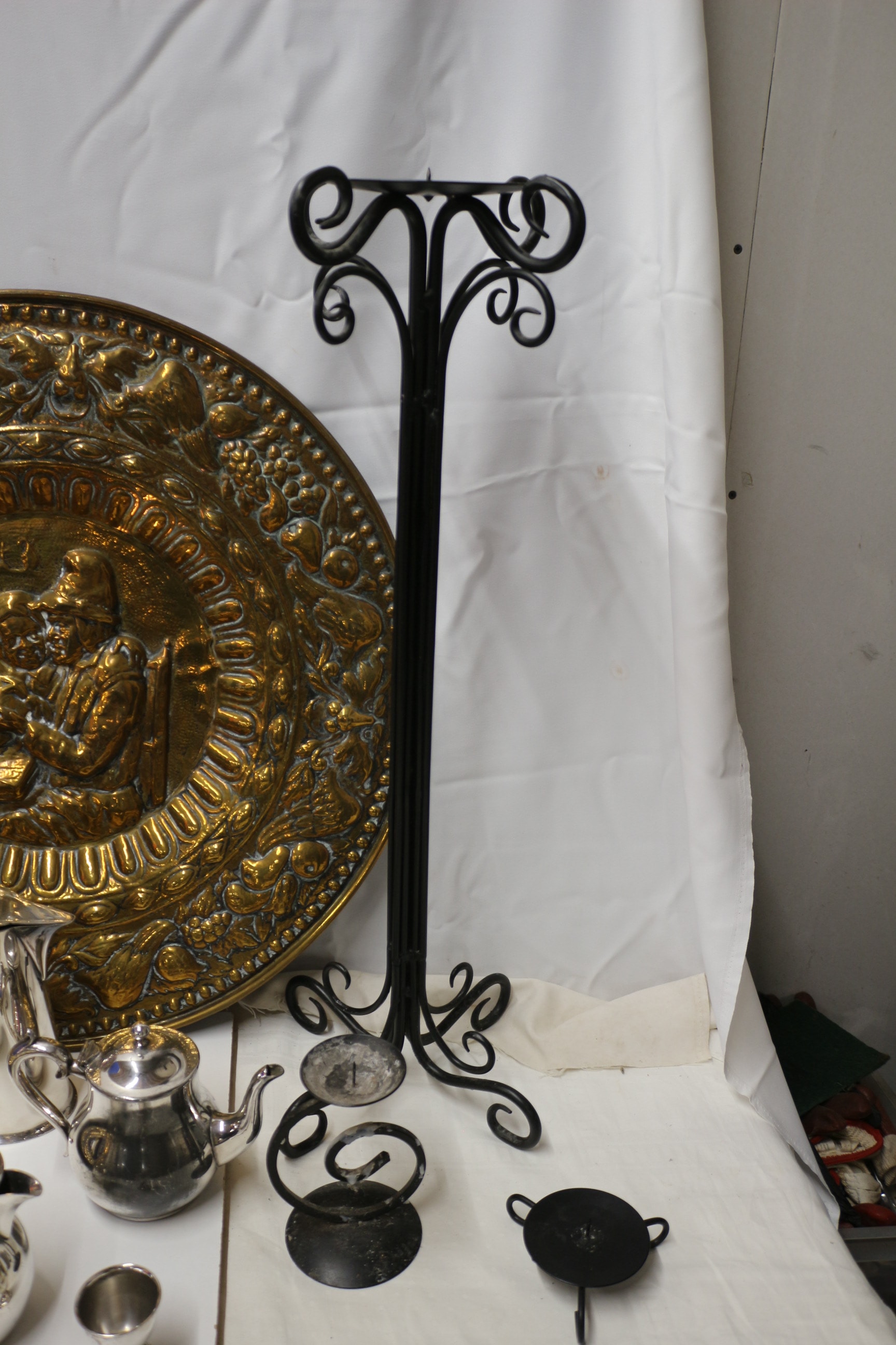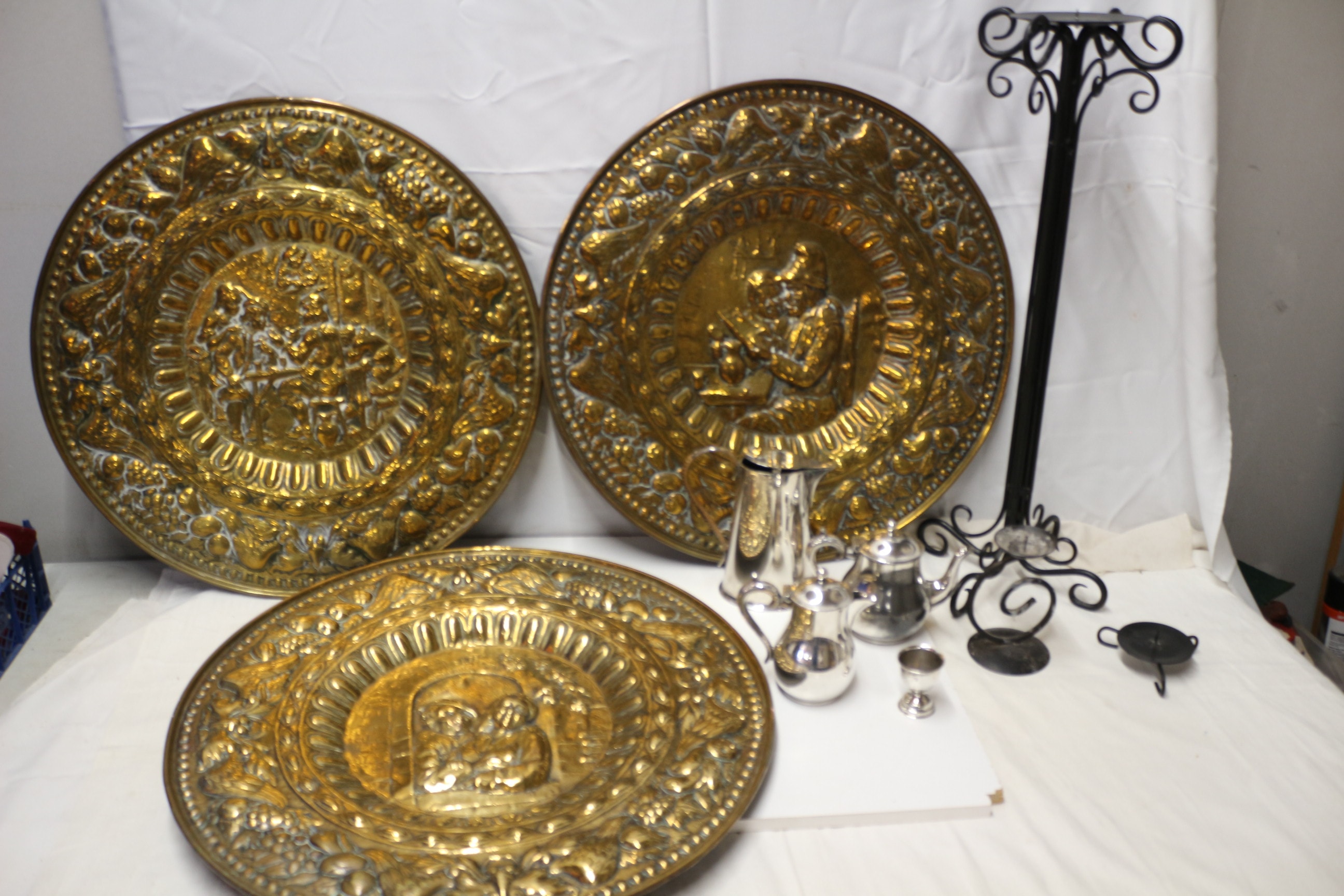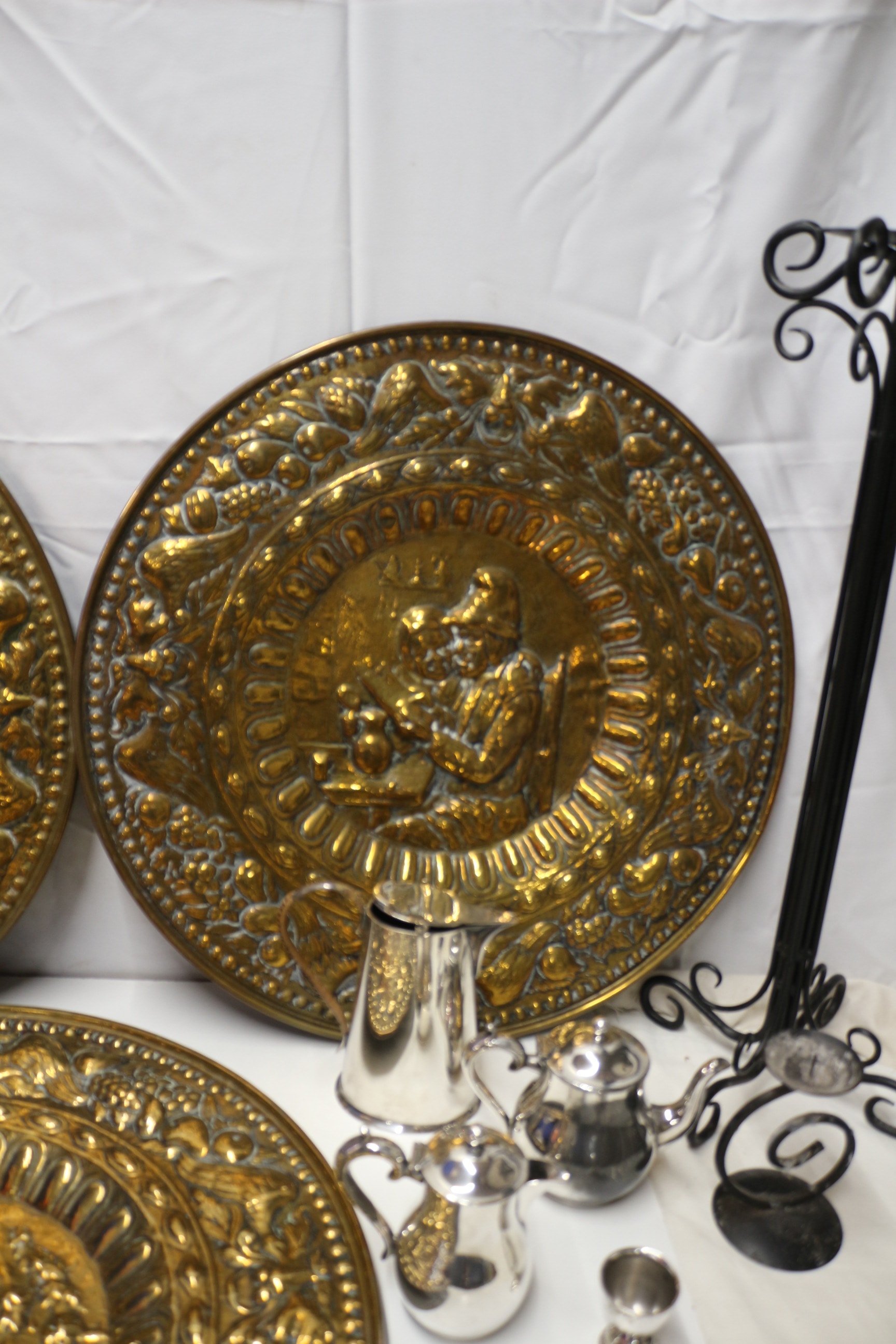 The lot includes three large golden/brass embossed decorative wall plates 61cm dia depicting various figural scenes, a group of four silver-toned metal serving items consisting of one tall pitcher, two teapots, and one small goblet, and three black wrought iron candle holders of various sizes and designs.