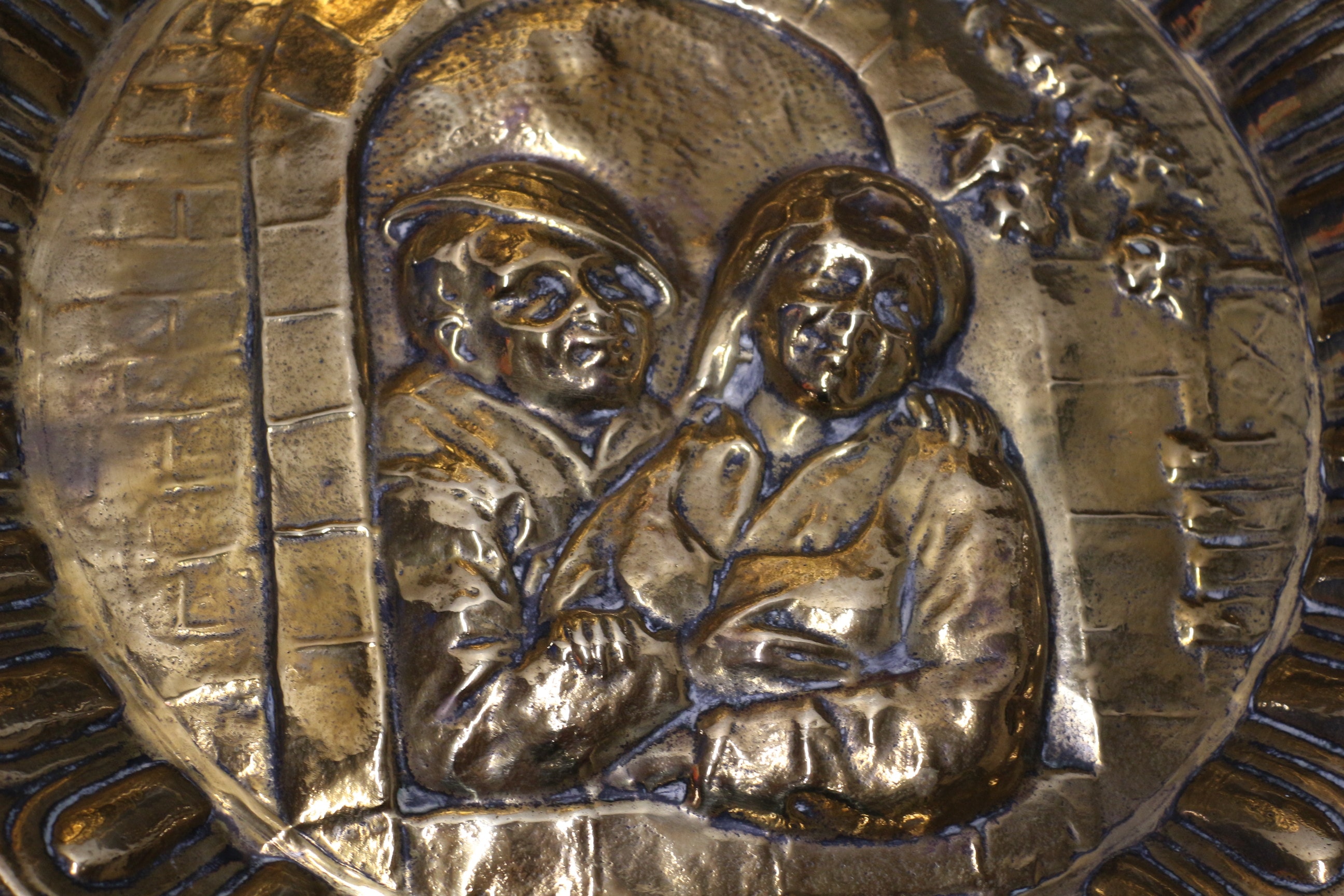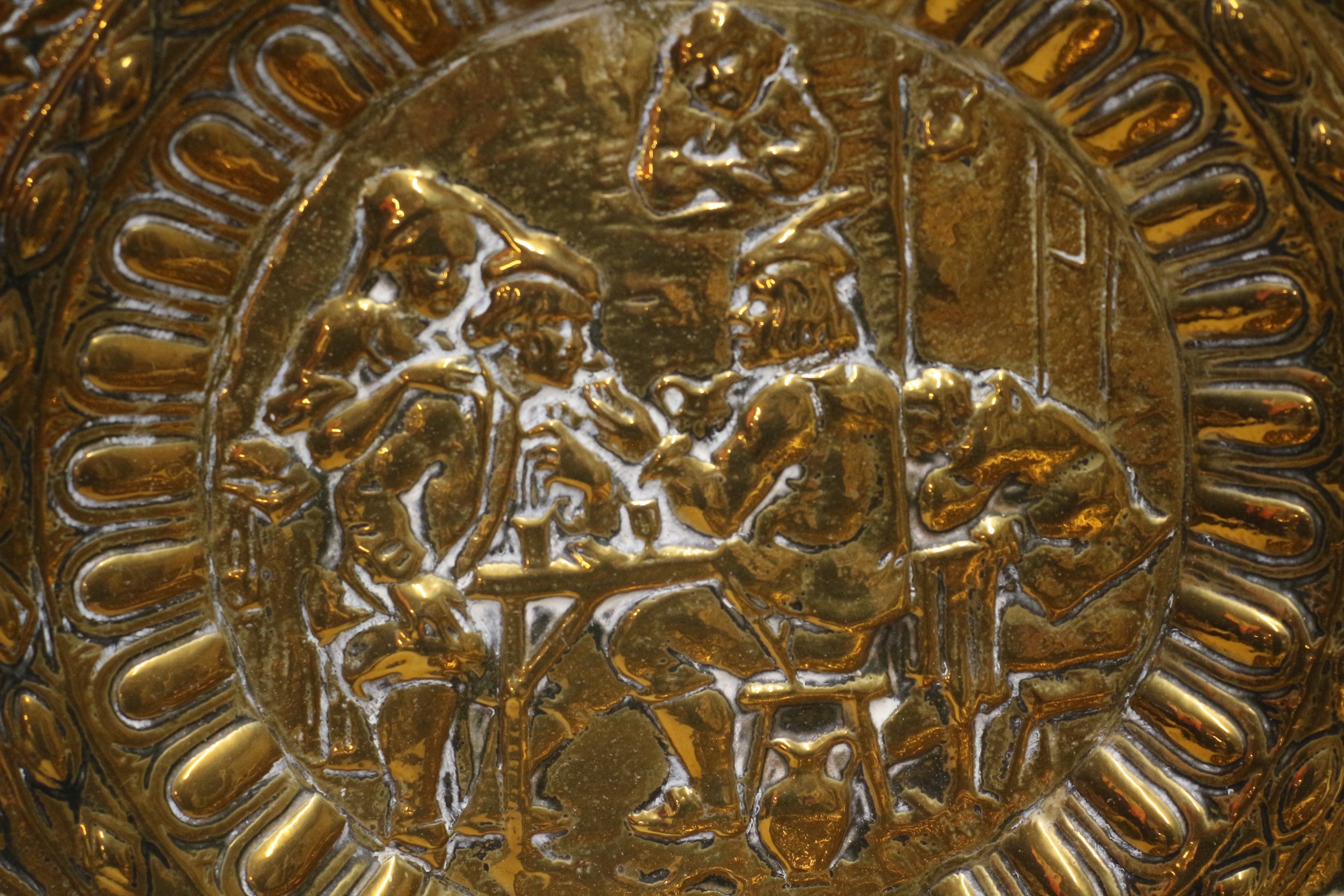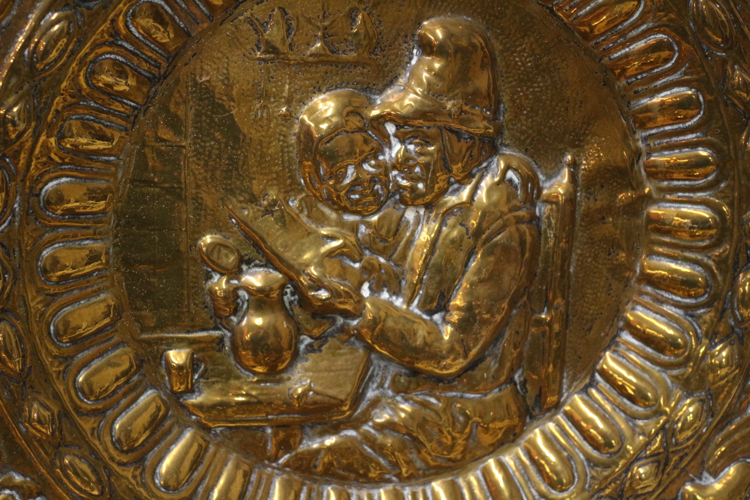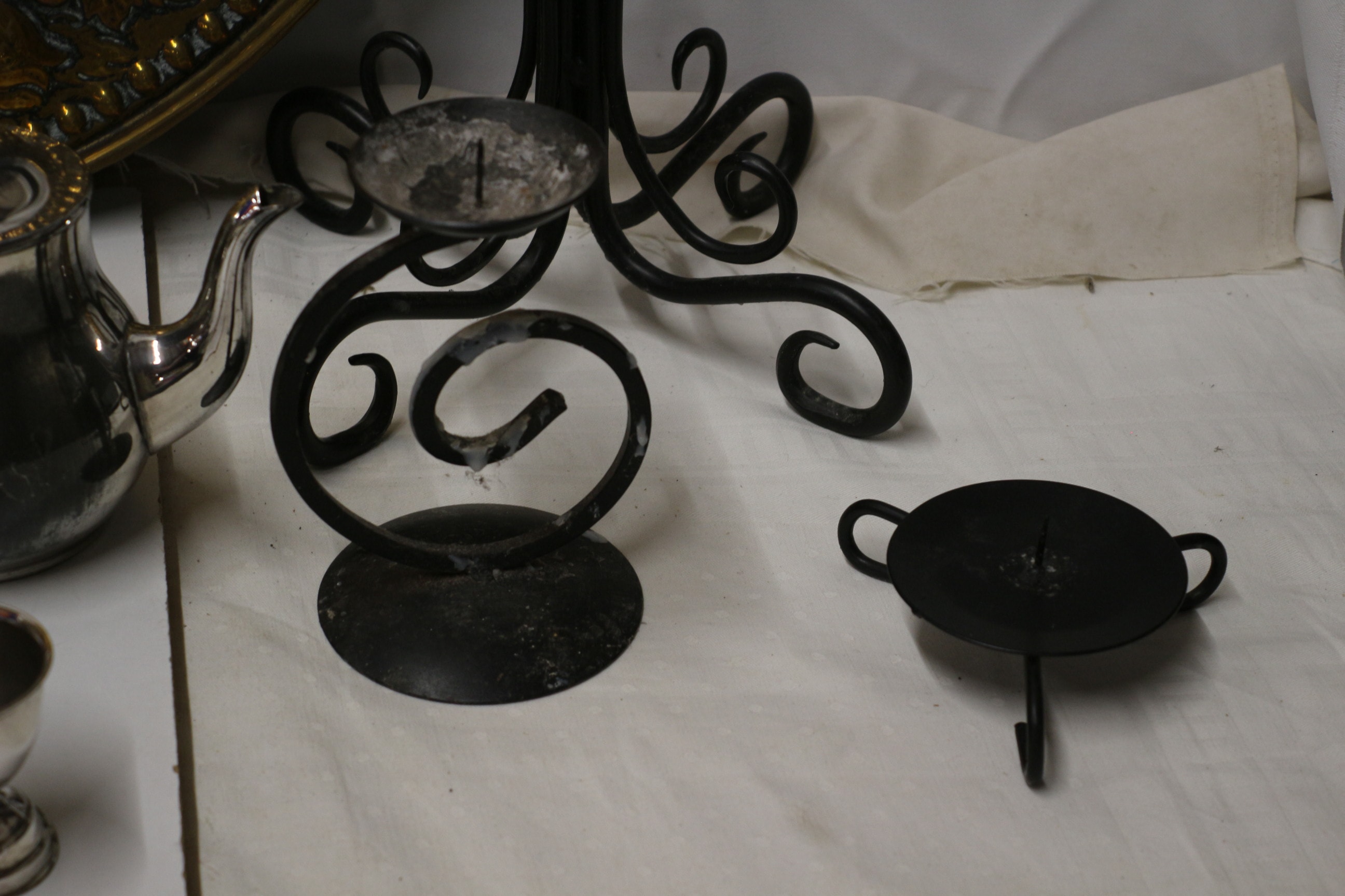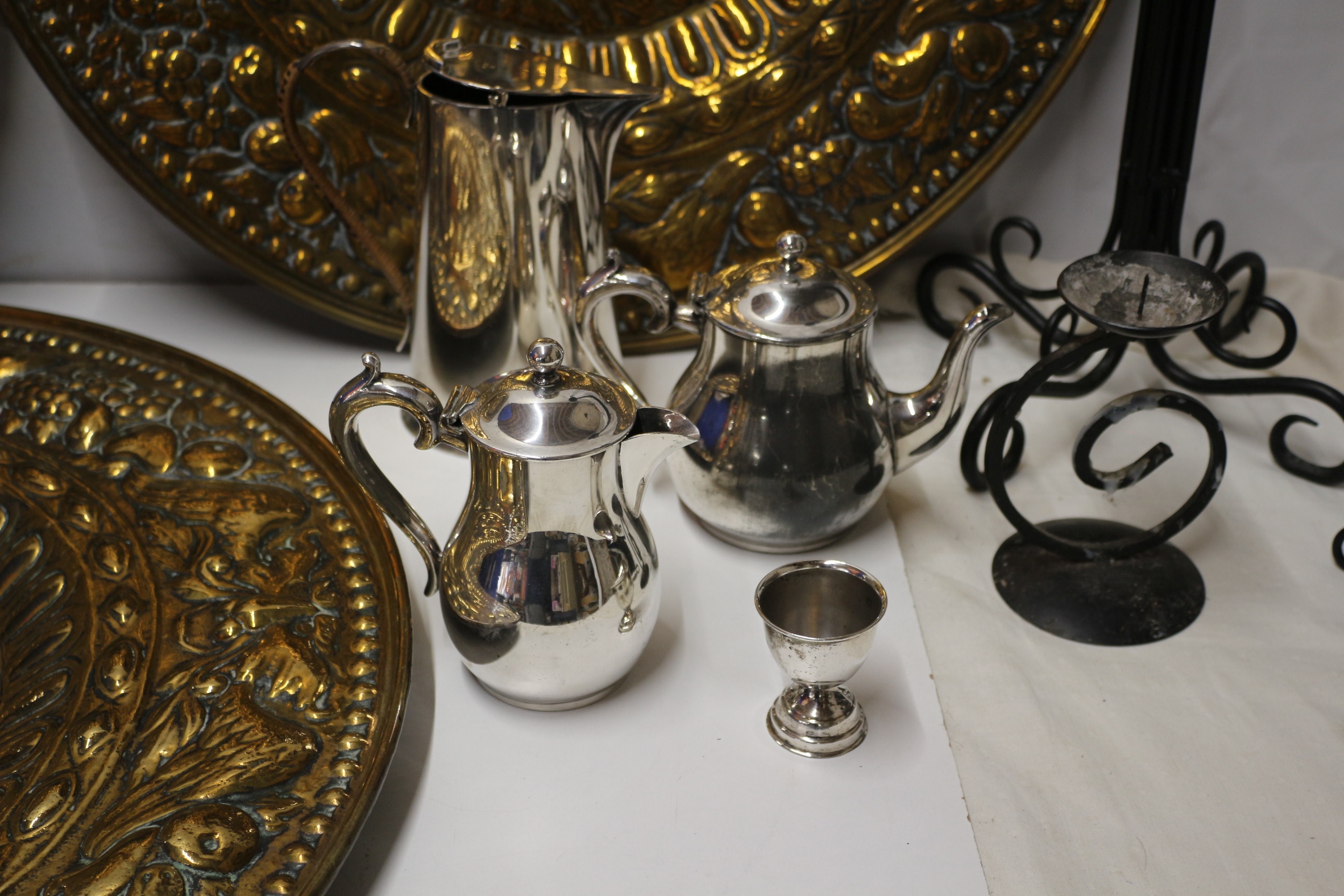 The lot includes three large golden/brass embossed decorative wall plates 61cm dia depicting various figural scenes, a group of four silver-toned metal serving items consisting of one tall pitcher, two teapots, and one small goblet, and three black wrought iron candle holders of various sizes and designs.
