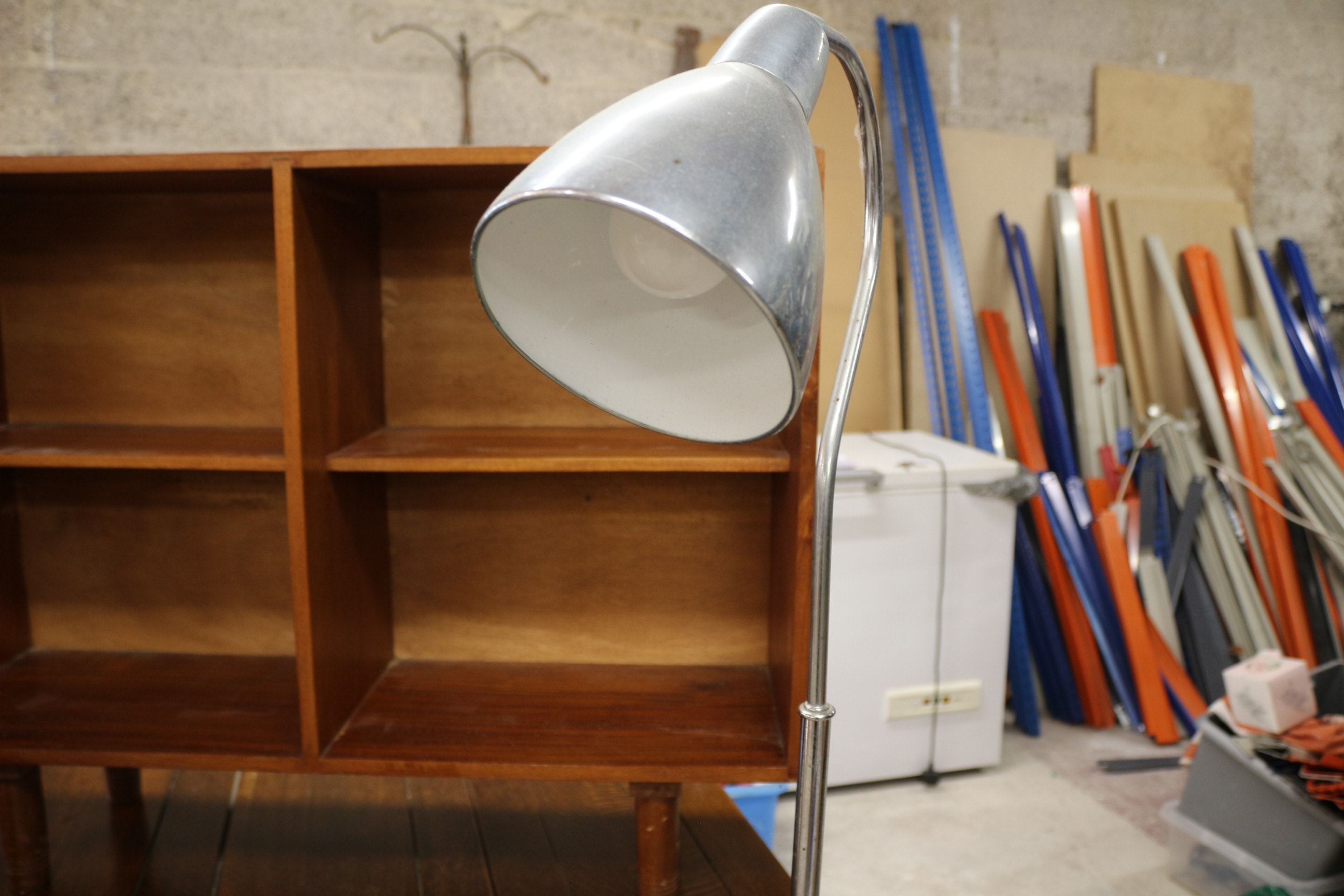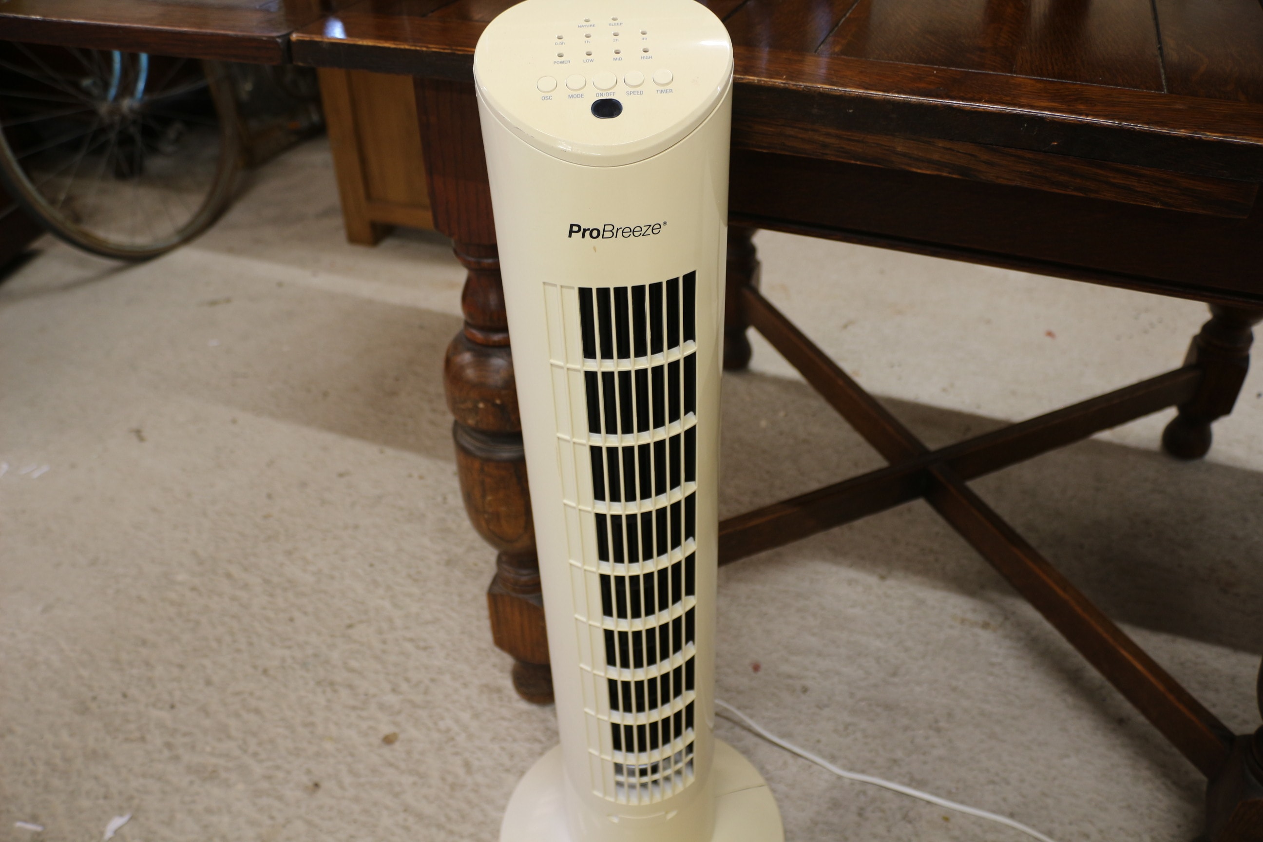 A collection comprising a set of three turned leg oak nesting tables, an dining table with turned legs, a small wooden bookshelf (AF), a ProBreeze tower fan, and a metal floor lamp.