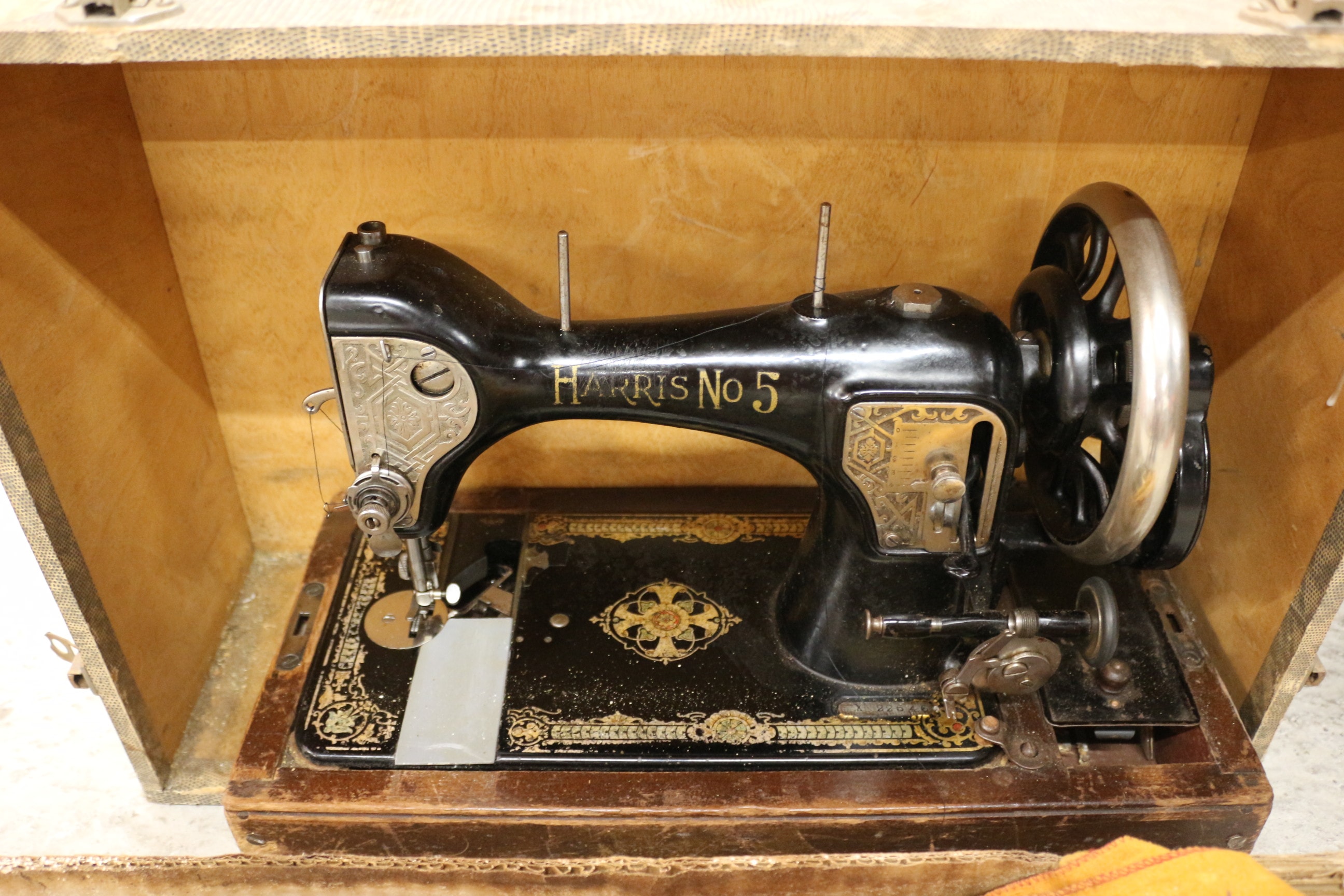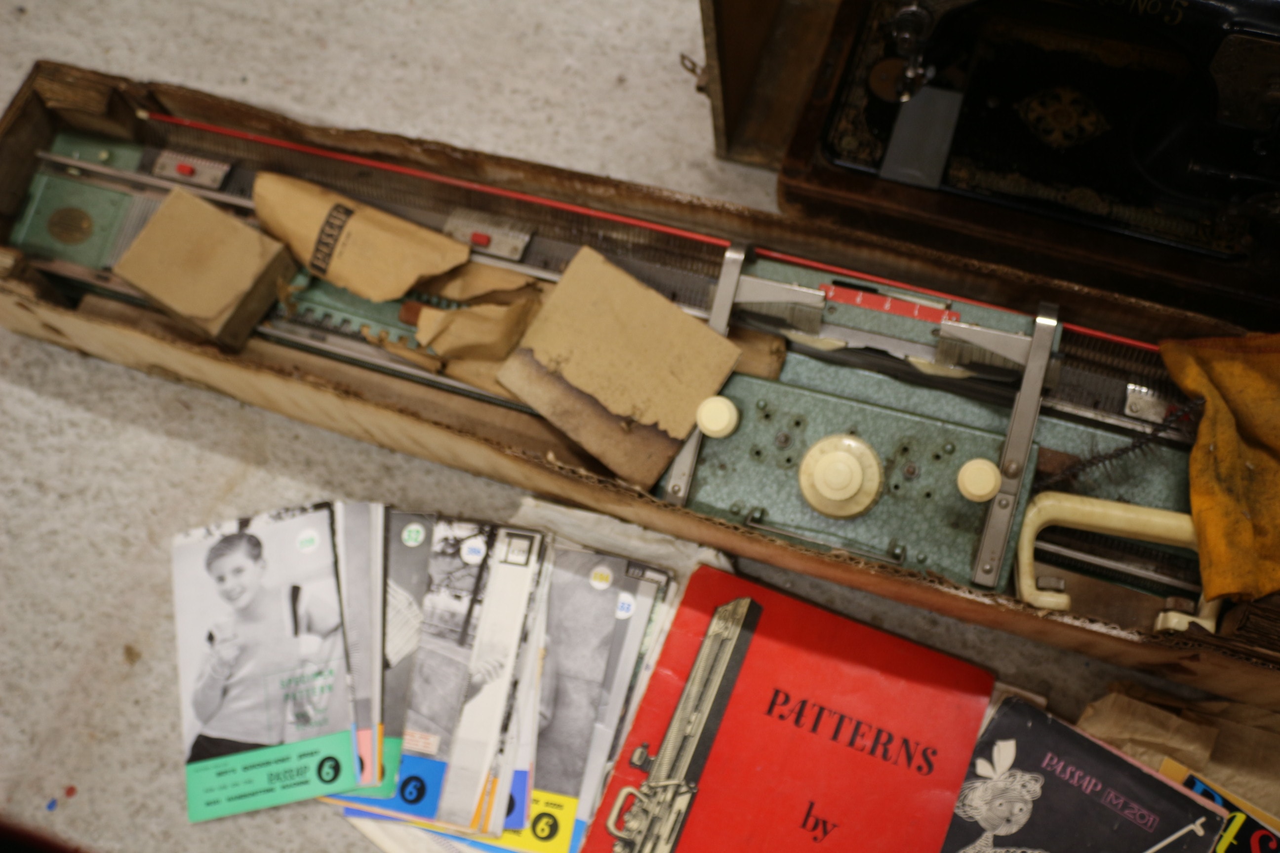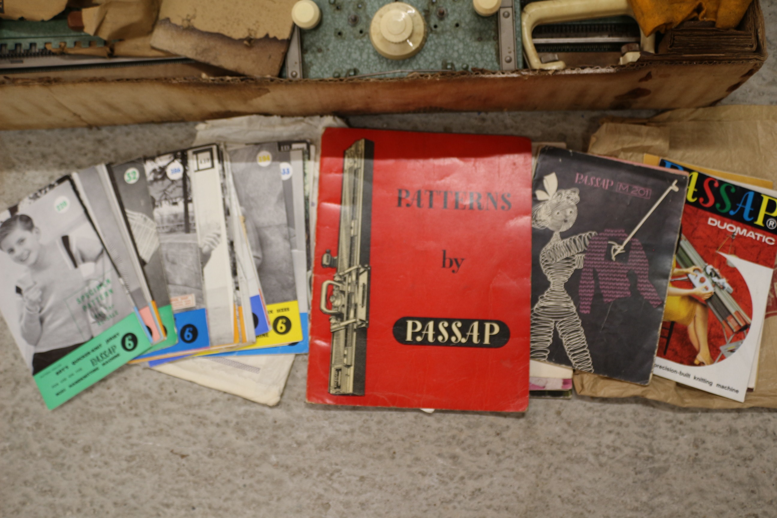 A black Harris No 5 sewing machine in a wooden case, a teal and metal knitting machine in a long wooden case, and a collection of multi-coloured knitting pattern booklets by Passap and Dassap. Untested