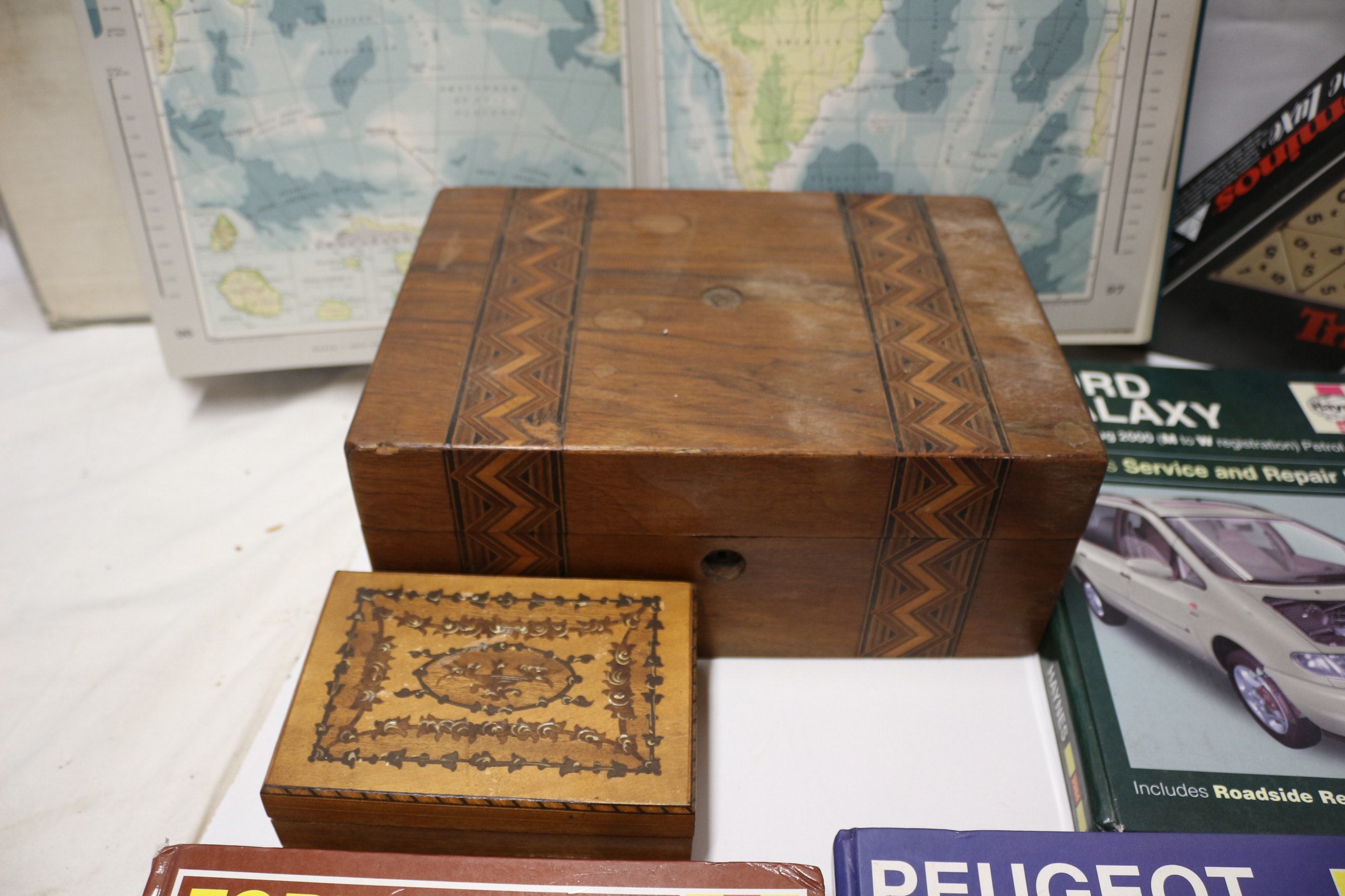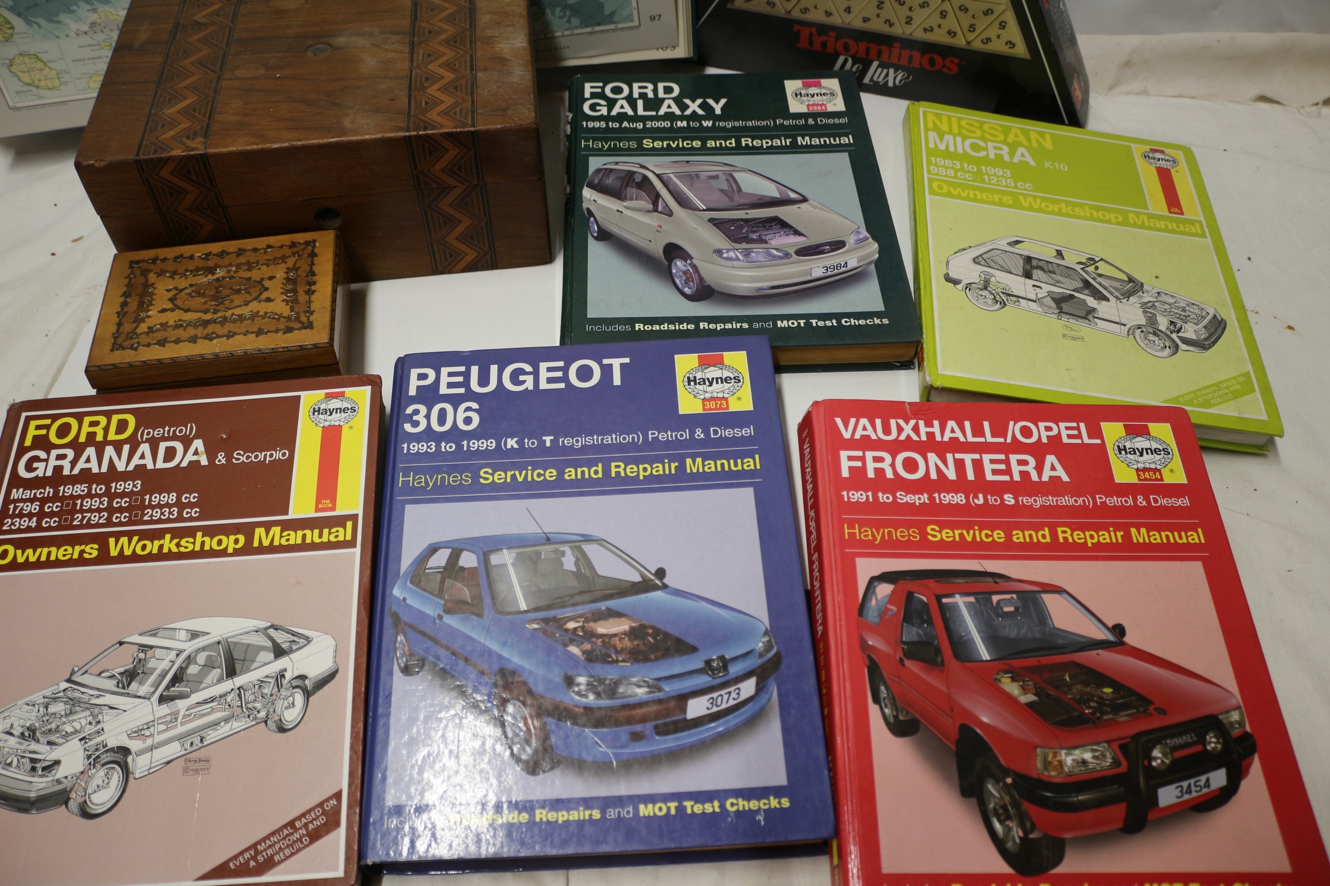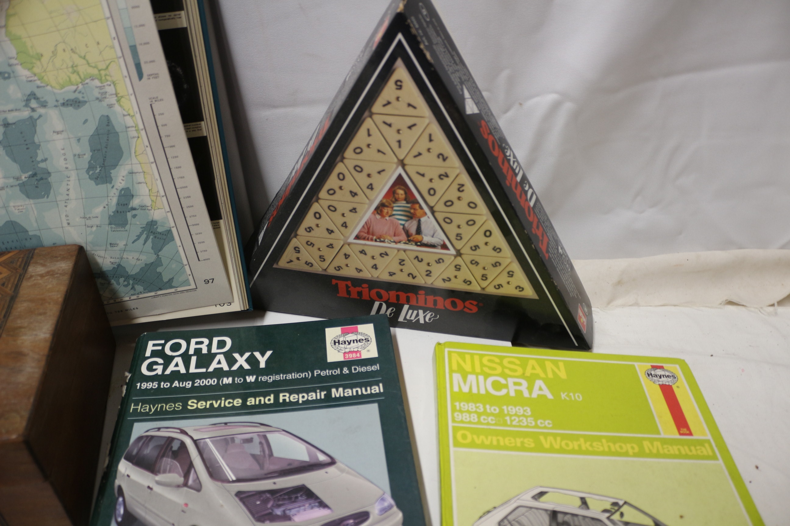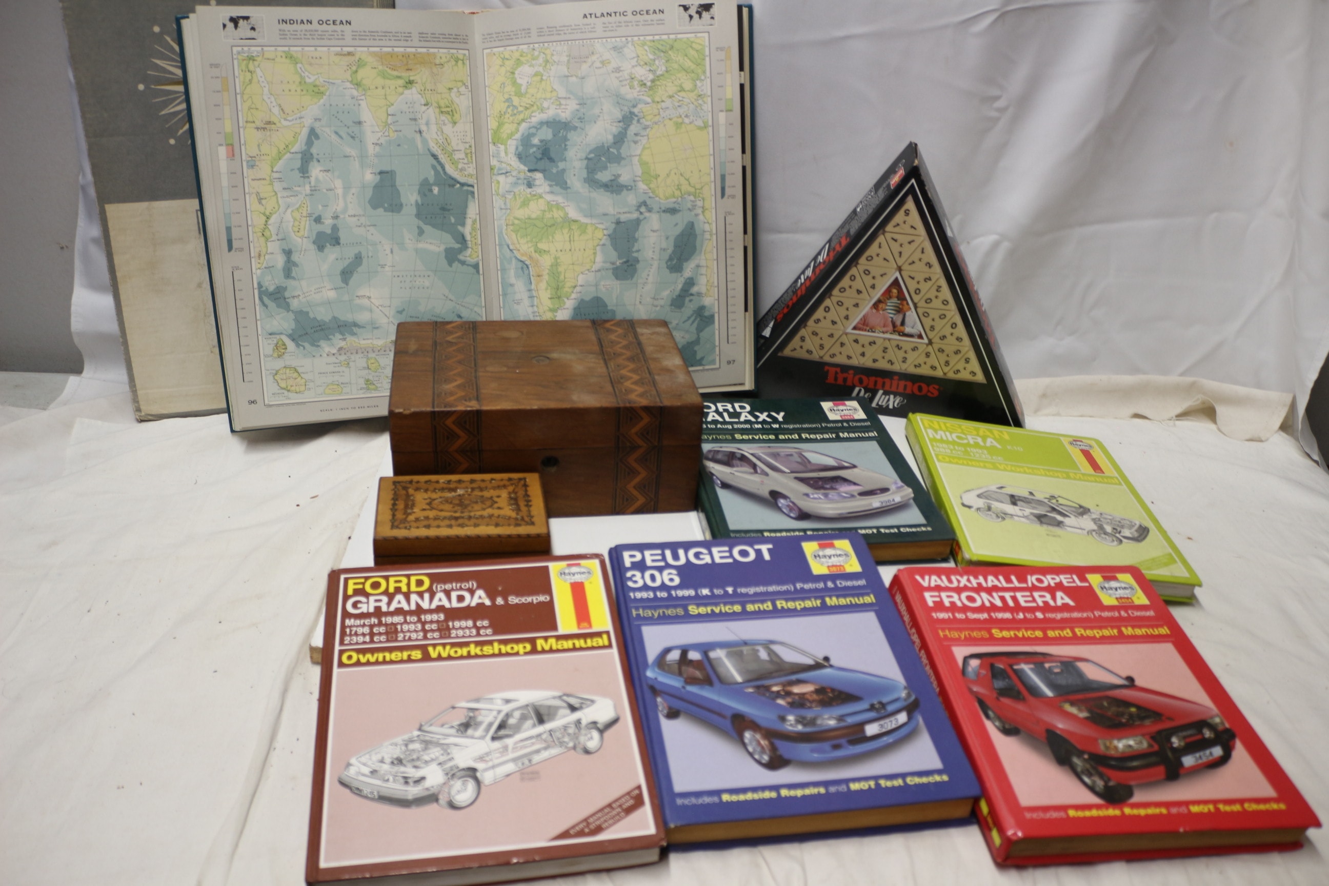 A collection of five Haynes car service and repair manuals, a pair of inlaid wooden boxes, an open atlas, and a Triominos De Luxe game.